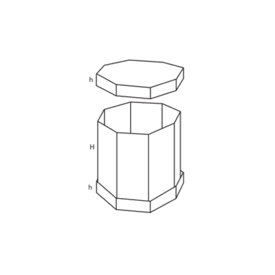 Телескопическая 8-мигранная коробка из плотного гофрокартона. От предыдущей модели 0350 отличается самосборной конструкцией двух крышек. Упаковка включает 3 элемента: Вертикальная обечайка. Включает 8 основных стенок, которые сгибаются по биговкам, и один небольшой отрезок, который приклеивается или крепится скобками внахлест. Две крышки. Каждая имеет цельное основание и стенки специальной конструкции, которые складываются по биговкам и не требуют склеивания и крепления скобками. Высота полученных деталей частично перекрывает обечайку, она может быть одинаковой или различной — по заказу. Данная серия чаще используется для складирования и перевозки товаров с круглым или овальным сечением, а также сувениров или любой другой продукции.