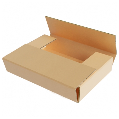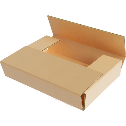 Оберточная коробка со стыкующимися клапанами широко используется для доставки и складирования плоской продукции. Изделие производится из гофрокартонного листа крестообразной формы. Конструкция формируется путем сгиба заготовки по восьми линиям. Ящик имеет четыре клапана, которые накладываются друг на друга. Перекрестные язычки повышают надежность коробки. Компактные размеры удобны для погрузки большого объема продукции в грузовой отсек транспортного средства.
