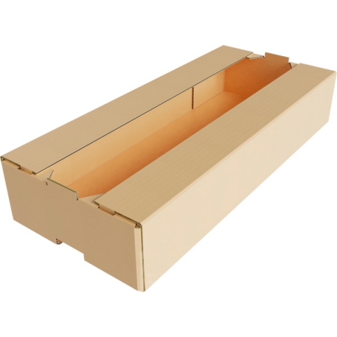 Самосборный лоток представлен в оригинальной конфигурации со сложной системой сгибов. Главным отличием от стандартных моделей является наличие частично закрывающегося верха. Перекрытие обеспечивается двумя узкими краями со стороны продольных стенок. Основой выступает картонная заготовка, которая нарезается по проектному шаблону. Лист загибается в разных направлениях. В нижней части торцевых гранях предусмотрены вырезы-ручки для удобства переноса ящика в пределах рабочей зоны.